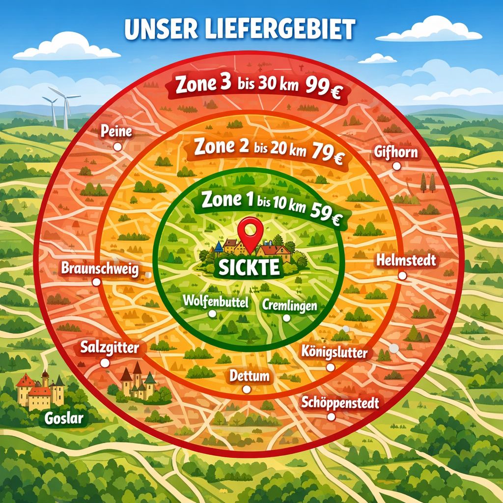 Wir liefern in einem Umkreis von 30 km um Sickte. Das umfasst unter anderem Braunschweig, Wolfsburg, Wolfenbüttel, Cremlingen, Helmstedt, Salzgitter, Gifhorn, Peine, Königslutter, Dettum und das Umland dazwischen 🙂